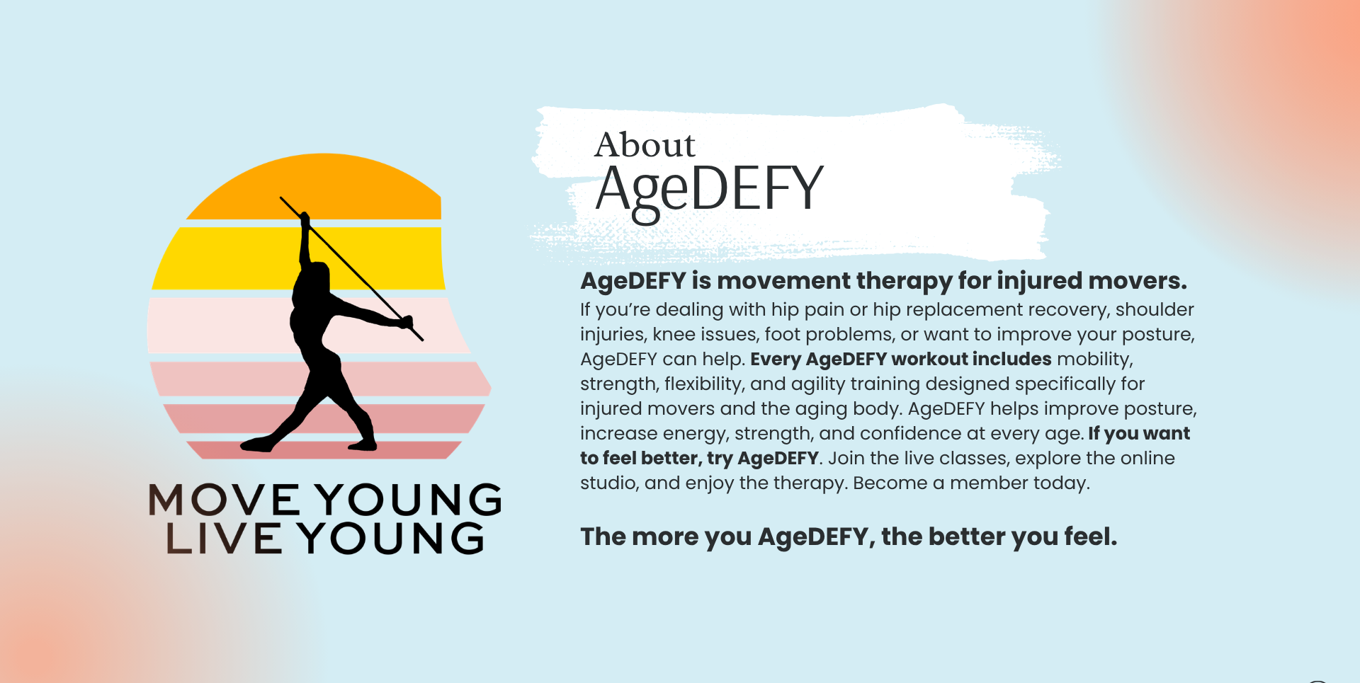 AgeDEFY is a movement therapy program designed for injured and aging movers to regain mobility, strength, and agility by using movement as medicine to feel better, look better, and live better!